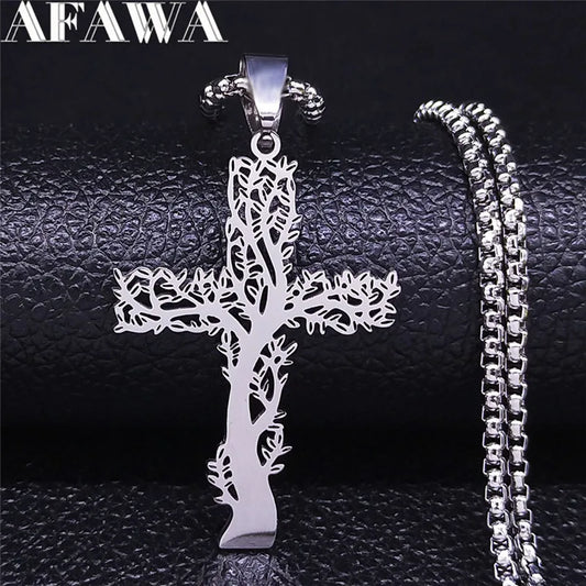 Tree of Life Cross Pendant Necklace, Men Women Aesthetic Jewelry Stainless